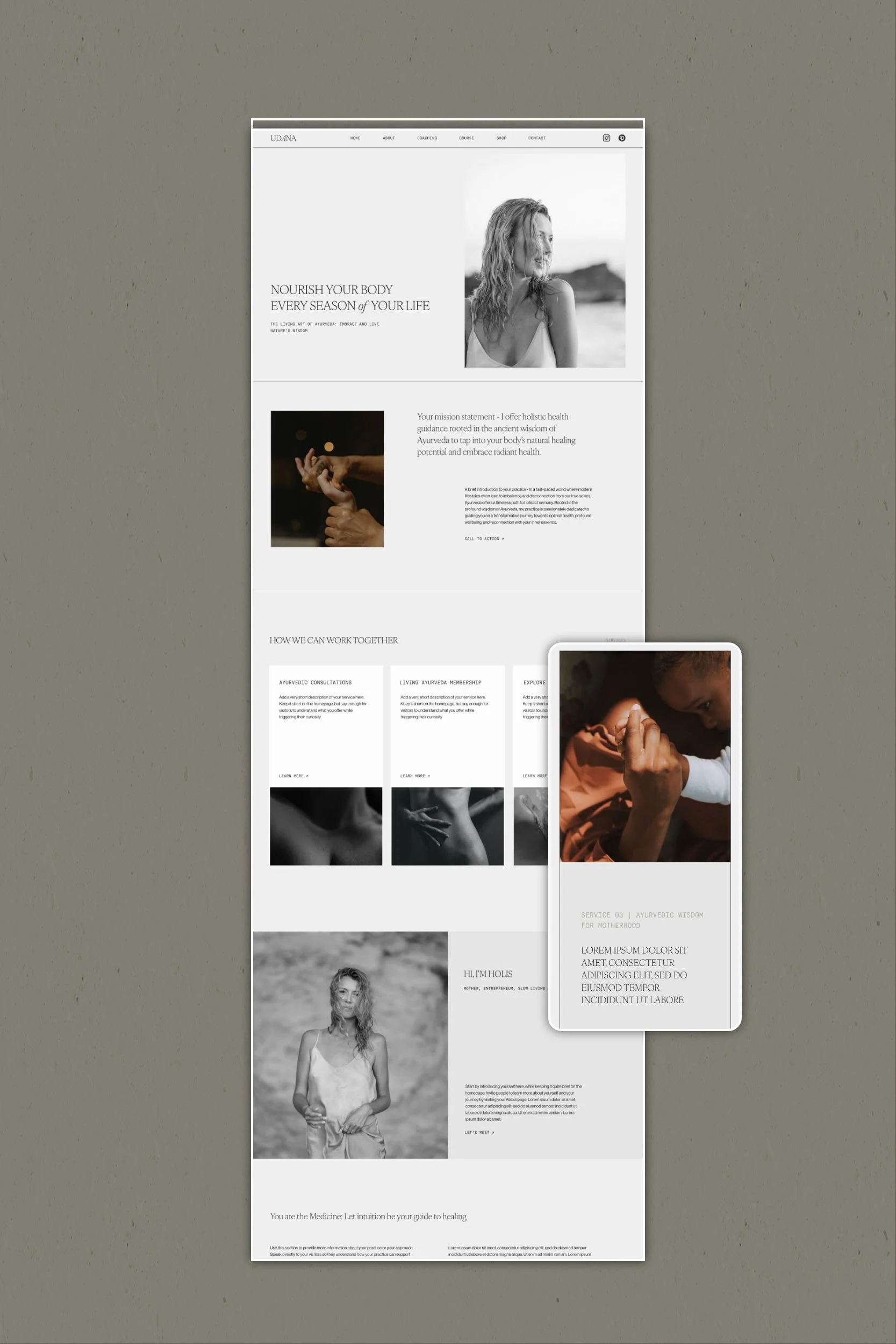 The design includes several service pages options that are all specifically designed to help you clearly communicate your offerings in a simple and compelling manner. UDANA is also an invitation to cultivate a deeper connection with your audience by sharing your story via the about page. UDANA also offers the flexibility to integrate your blog, shop, podcast, or online course, allowing you to showcase your diverse offerings while ensuring a cohesive online presence.